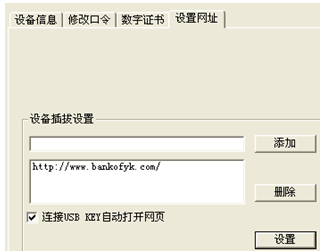 ?、谠蚴菦]有勾選自動打開網(wǎng)頁。雙擊小黃鎖或者是我行EK圖標——設置網(wǎng)址,進入下圖畫面,將我行網(wǎng)址m.ndndc.com添加入列表,勾選“連接USB KEY自動打開網(wǎng)頁” ,且點擊設置。