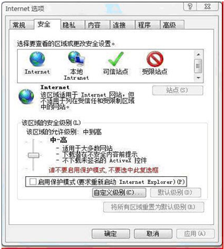 ?、热绻荲ista或win7(某些版本有保護模式)操作系統(tǒng)用戶,請按照下圖將IE受保護模式取消。